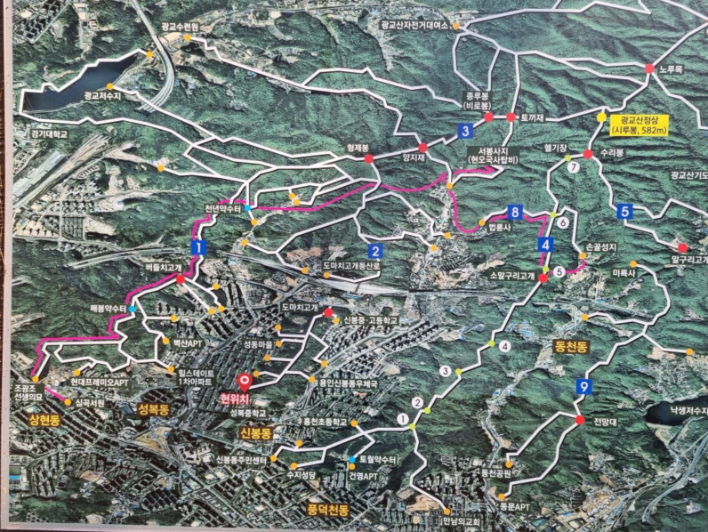 용서고속도로가 가로막혀 있어서 광교산까지 한번에 갈수는 없는데요,
