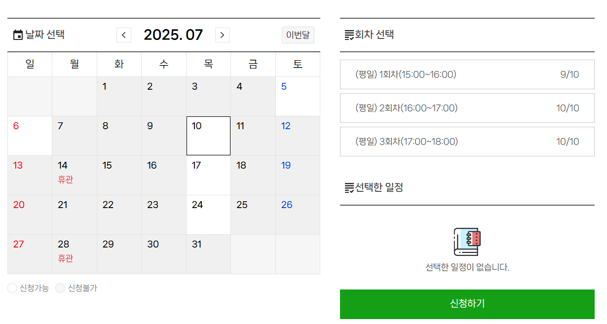 달력에서 신청 가능한 날짜를 클릭하면, 신청 가능한 회차를 선택할 수 있게 되어있습니다. 이미 마감이 된 회차는 선택이 불가합니다. 성복 도서관의 경우 6월은 시험 신청이 불가하고, 7월엔 흰색으로 표시된 날짜에만 가능하다고 나오네요. 7월 10일의 경우에는 2회차와 3회차는 이미 마감이고, 1회차에는 1명 더 신청이 가능한 상태입니다.