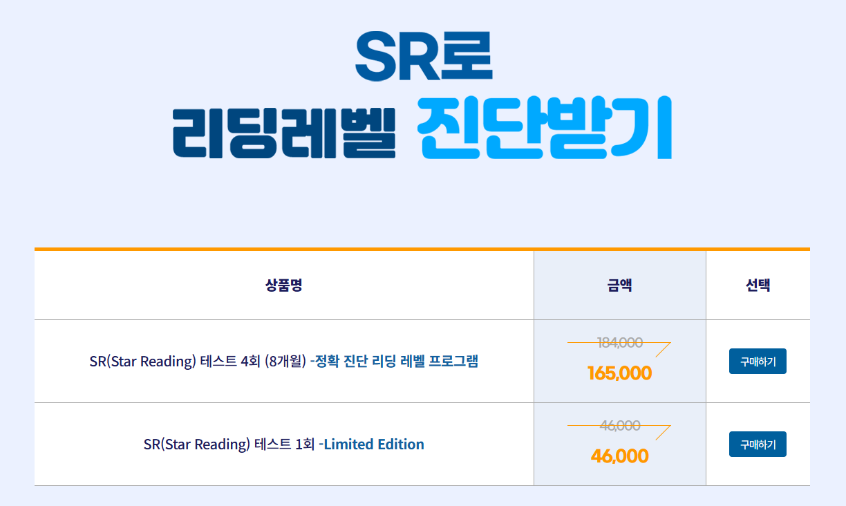 SR테스트는 르네상스러닝 홈페이지에서 진단해볼 수 있는데요, 유료로 진행이 됩니다. 현재 르네상스 마이온 홈페이지에 들어가서 확인해보니 SR(Star Reading) 테스트 4회에 165,000원, 그리고 SR 테스트 1회에 46,000원이라고 나와있네요. 음.. 저희집엔 초등학생이 3명이 있는데, 1회권으로 테스트를 받는다고 해도 3명이면 무려 138,000원 입니다. 집에서 간단히 시험을 볼 수 있지만 비용이 부담되는 것이 사실입니다.