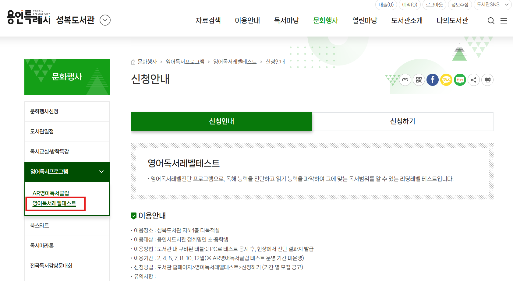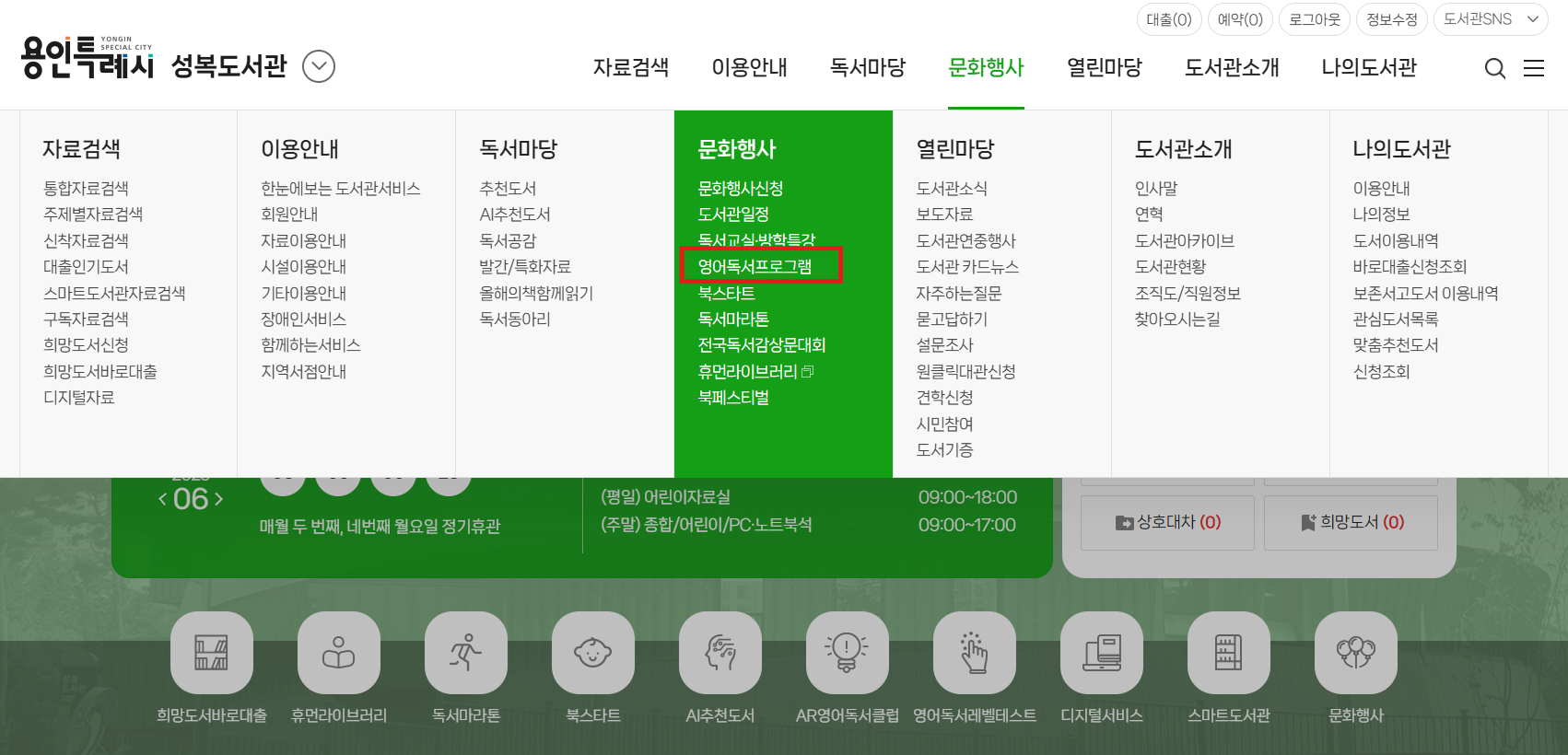 그렇다면 이 SR 지수 테스트를 무료로 받을 수 있는 방법이 있을까요? 바로 지역 공공도서관을 이용하는 것입니다. 제가 사는 곳 근처의 성복도서관 홈페이지에 들어가서 확인해보니 무료로 SR 테스트를 해주고 있습니다. 일단 테스트를 받고자 하는 어린이 이름으로 가입을 하신 후, 어린이 아이디로 홈페이지에 로그인 해야 합니다. 이후 문화행사 탭 아래의 "영어독서프로그램"을 클릭합니다.