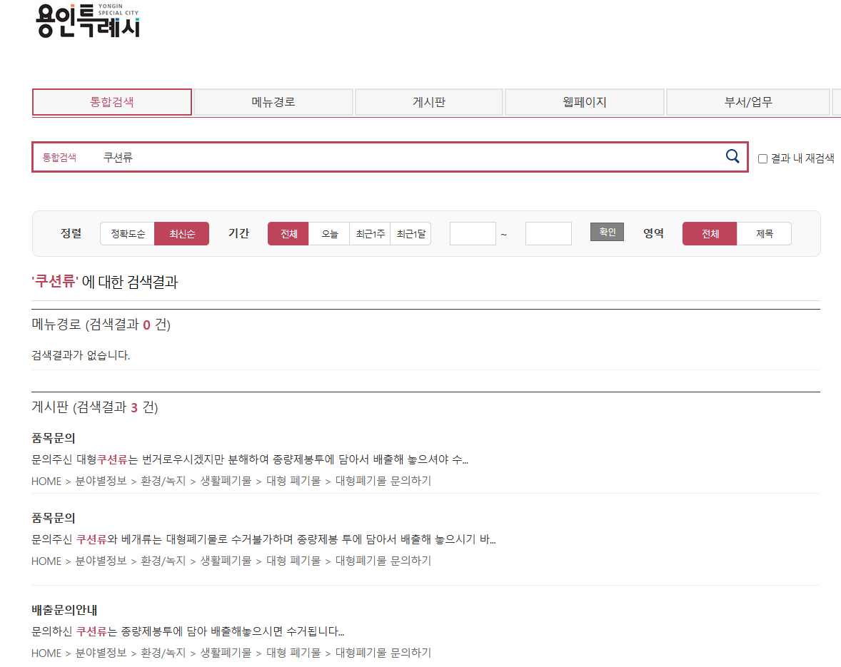 베개의 경우 지자체마다 규정이 다른데요, 용인시의 경우 쿠션류와 베개류는 대형폐기물로 수거 불가하며, 종량제봉투에 담아서 배출하시면 됩니다. 용인특례시 홈페이지 게시판에서 답을 찾았답니다. ^^ 3가지 질문사항에 대한 답이 일관되게 종량제 봉투를 사용하라는 것이니 종량제 봉투 사용이 맞습니다.