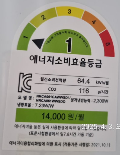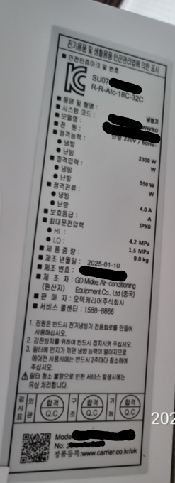 기기 명판은 신규 기기의 모델명, 제조번호 등이 나와있는 표시인데요, 보통 기기에 스티커 형식으로 부착되어 있습니다. 제가 신규로 설치한 에어컨의 명판 사진은 다음과 같습니다. 제조번호 확인이 필수로 되어야 합니다. (제조번호 또는 S/N 기재된 번호)