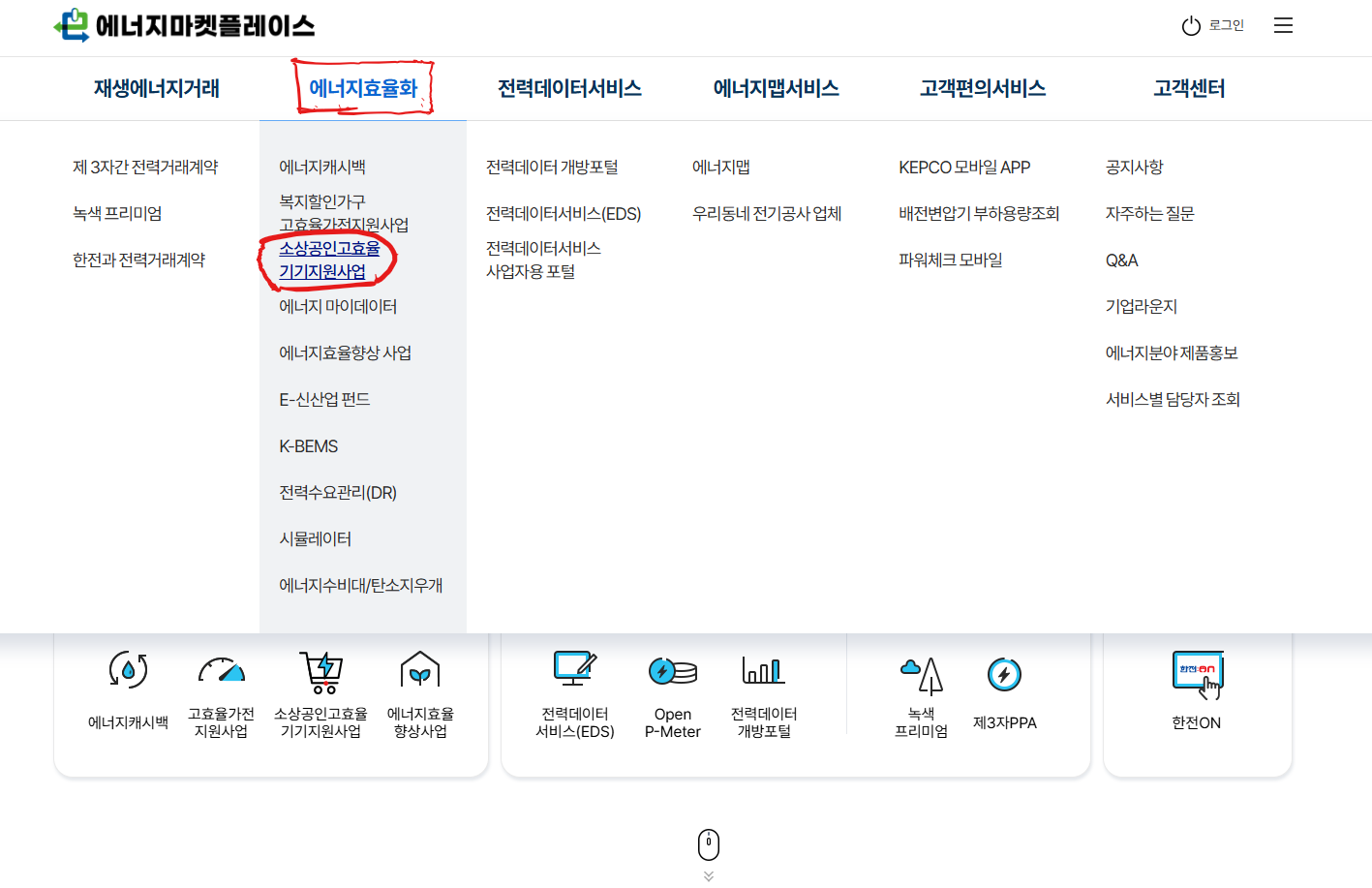 2. 에너지효율화 탭 아래에 있는 "소상공인 고효율 기기지원사업" 을 클릭합니다.