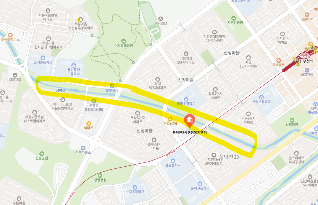아래 사진에 풍덕천2동 행정복지센터 위치와 산책코스를 표시해 놓았습니다.